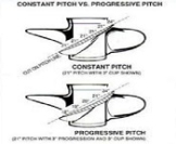 A propellers blade shape will affect its performance. Most outboard and sterndrive propellers are constant pitched across the entire high-pressure face. Some are progressively pitched. A progressive pitched propeller is less prone to cavitation and will give increased acceleration and general performance. This is because the leading edge will be a lower pitch so the water is picked up under less pressure. The water then flows along the blade surface increasing in pitch to the trailing edge where it is forced into a tighter thrust funnel and this gives higher efficiency. Some propeller have blade rake, rake is when the blades lean or slop either forward or aft as viewed from the side. Blades that slop aft have positive rake and this will give the effect of increased top end speed, but less acceleration and is generally designed to increase bow lift. Blade area has an effect on performance, propellers with relatively high blade areas will have reduced blade loading and therefore suffer less from cavitation. Blade shape also has an effect. Generally pointed blades, such as cleaver types, will give stern lift. Rounded high rake blade shapes generally give bow lift. Some propellers have vent holes or slots at the root of the back face of the blade. This introduces air from the exhaust to the propeller, which reduces cavitation. Since cavitation is air bubbles in vacuum the aeration from the exhaust gases helps prevent cavitation from occurring. This is called ventilation i.e. air introduced to the propeller blade. These propellers are generally constant pitched. The latest and most efficient propellers are progressive pitched. These are less prone to cavitation and therefore do not generally require vent holes or slots as the blade loading is significantly reduced.